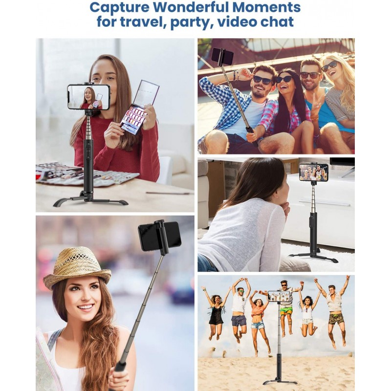 All-in-one design + αφαιρούμενο τρίποδο: 2-σε-1 selfie stick με ενσωματωμένο σχεδιασμό καινοτομίας ταιριάζει καλύτερα στην τσάντα σας. Μετά την επέκταση, είναι το ελαφρύτερο, πιο εξαιρετικό και σταθερό αφαιρούμενο τρίποδο selfie με αντιολισθητικό πέλμα. Μπορείτε να τραβήξετε selfies ή ομαδικές φωτογραφίες (ό, τι σε λειτουργία χειρός ή τρίποδο).