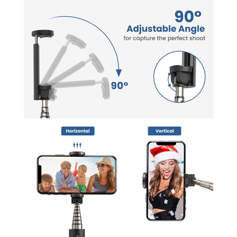 Premium selfie stick: το selfie stick κατασκευασμένο από βελτιωμένο κράμα αλουμινίου επεκτείνει το μήκος μεταξύ 16,5 cm και 73 cm (συμπεριλαμβανομένου του μήκους της θήκης του κινητού τηλεφώνου) για πιο οικείες λήψεις και μεγαλύτερες γωνίες, ώστε να μπορείτε να τραβήξετε περισσότερες σκηνές σε κάθε φωτογραφία. (Η ρυθμιζόμενη θήκη κινητού τηλεφώνου κρατά το πλάτος του κινητού τηλεφώνου: 5,5 - 9 cm)